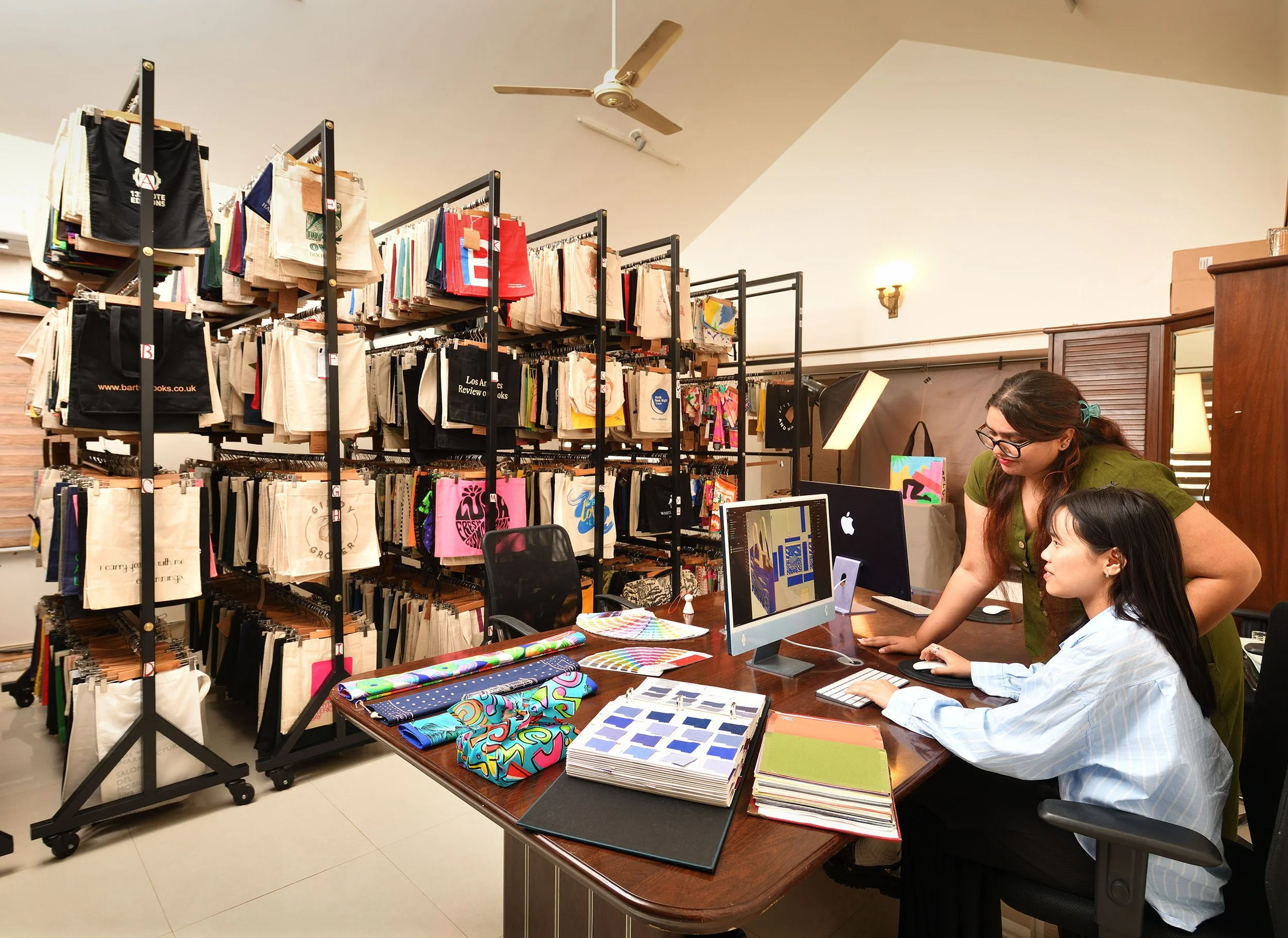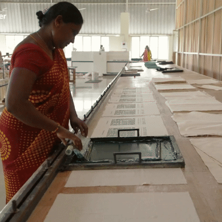 This year we expanded our in-house printing facility at our Mysore creation unit, which means that most of our tote bags are now printed on-site. This in-house investment allows us to reduce the carbon footprint of our product. We now offer manual screen printing at the same bright and airy site where our bags are cut and sewn. This exciting development provides livelihood and up skilling for a team of 20 artisans.